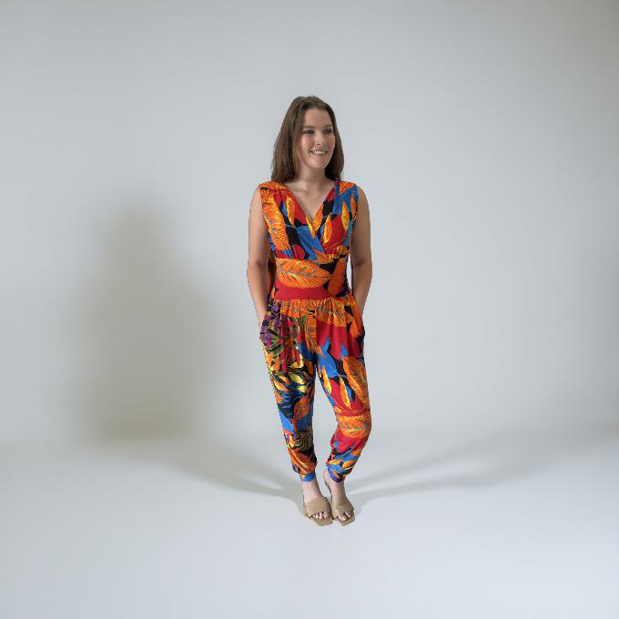 Claire Jumpsuit Orange leaf print Our designer Claire style jumpsuit – 100% Rayon. A sexy, easy-to-wear jumpsuit with a high-waisted band and pockets, covers the shoulders with style. Night or day this is a WINNER! One of our top sellers !