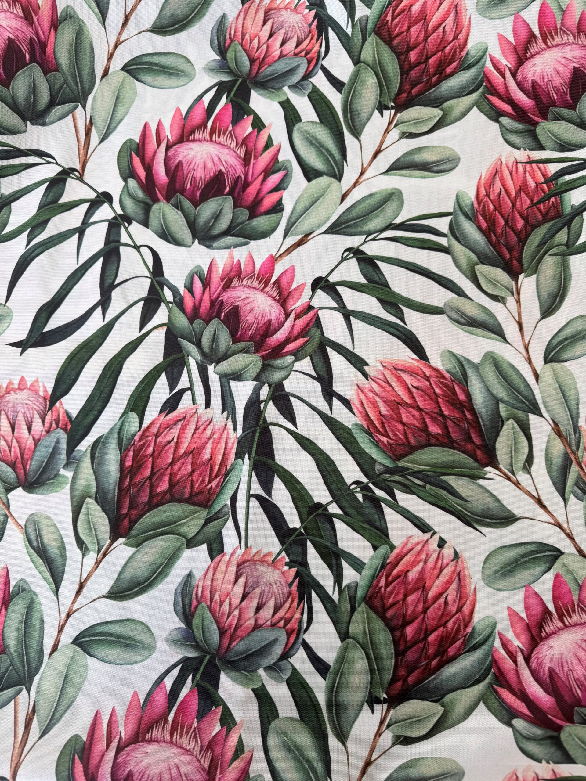 Pink, green protea Our table cloths are made with a high quality mini Matt fabric , which make them easy to wash and use.